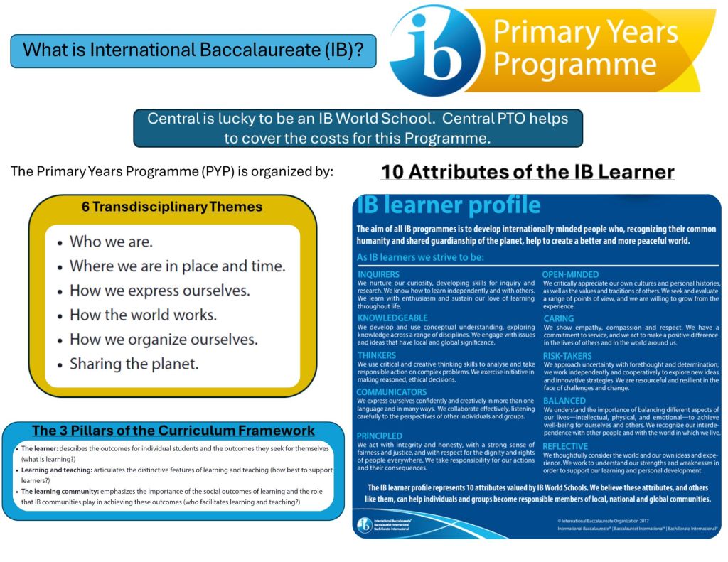 The Central Elementary PTO supports Central Elementary in its mission as an International Baccalaureate Primary Years Programme (IB PYP) school. The programme is fundamental to our school’s identity and teaches our children to study topics that are of importance in the world in which we live.